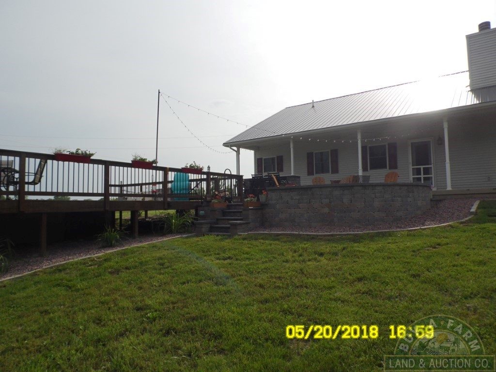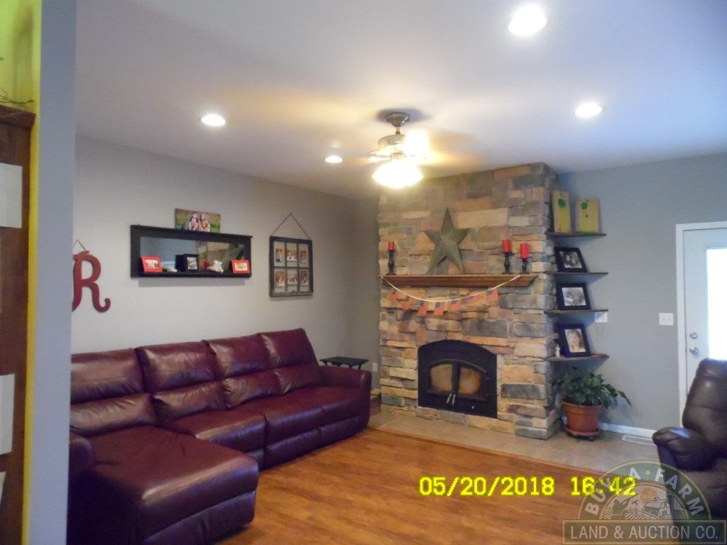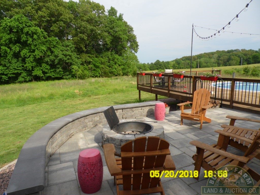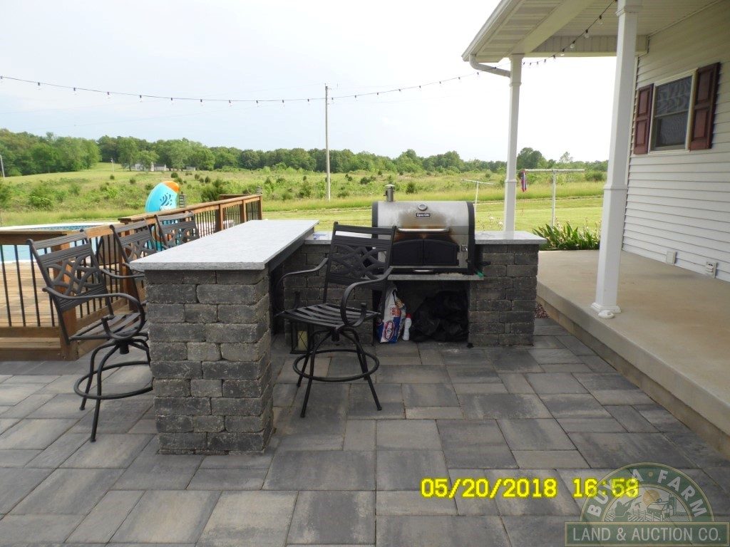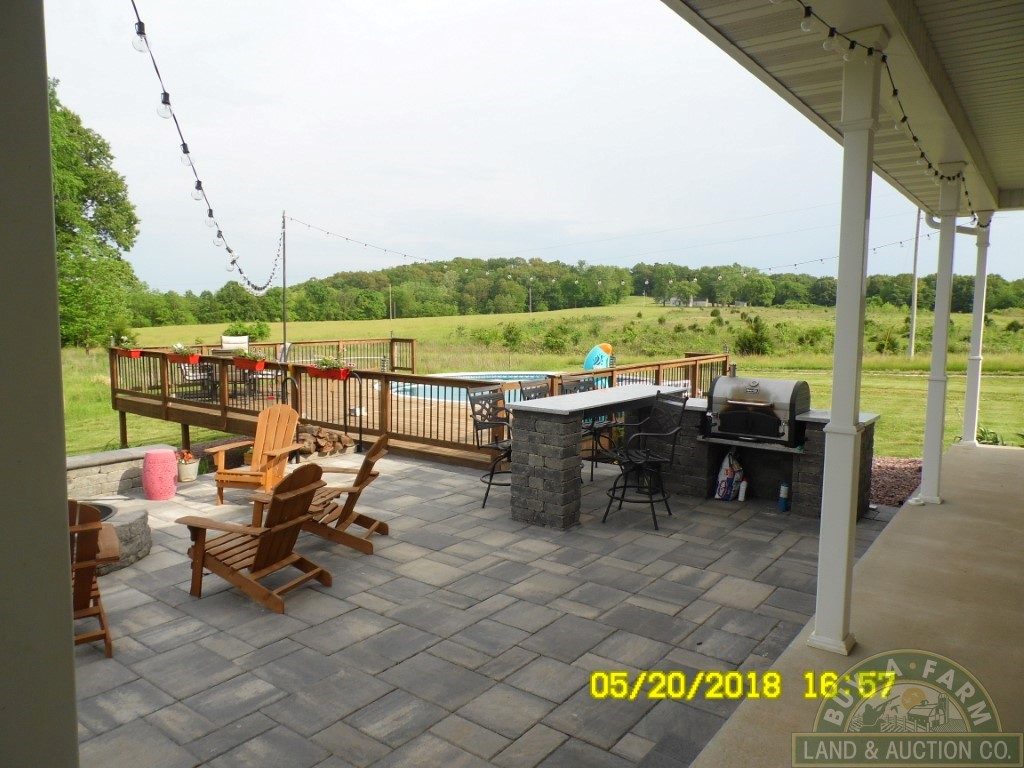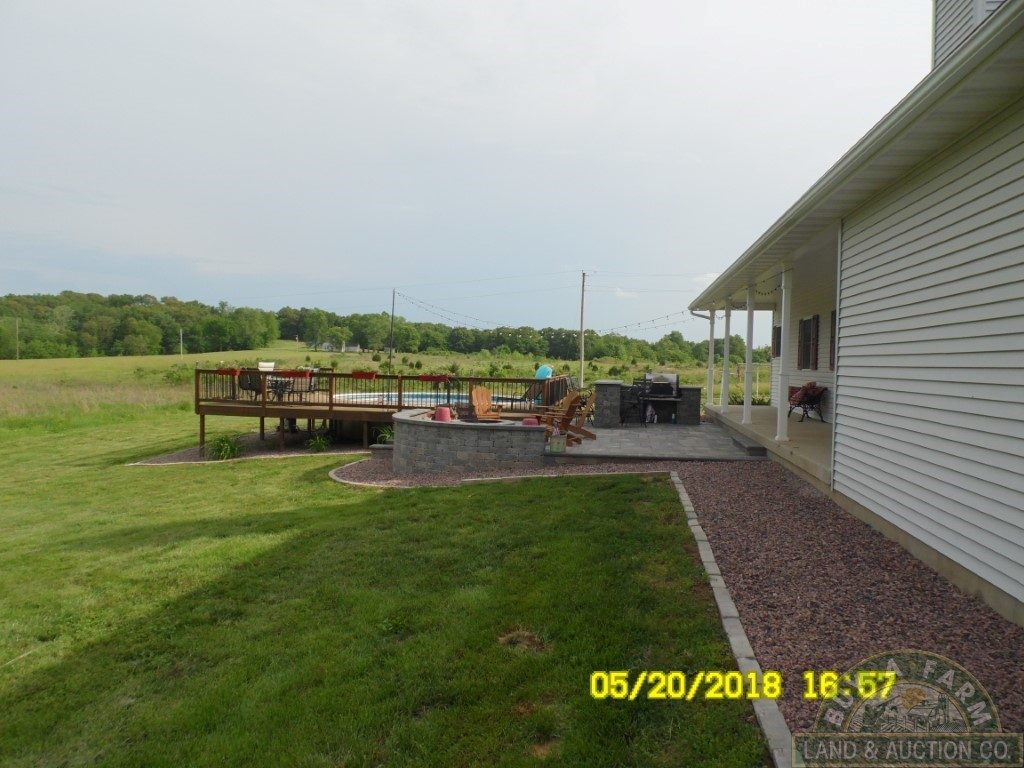 A country kitchen with an abundance of cabinets opens into a hardwood-floored great room featuring a stone fireplace with a built-in forced-air heat chamber. The great room flows onto a spacious outdoor patio. The stone paved patio has a custom fire pit, a built-in grill and deck integrated above-ground pool that looks beyond the grassland to the south and into the timber where wildlife is abundant.