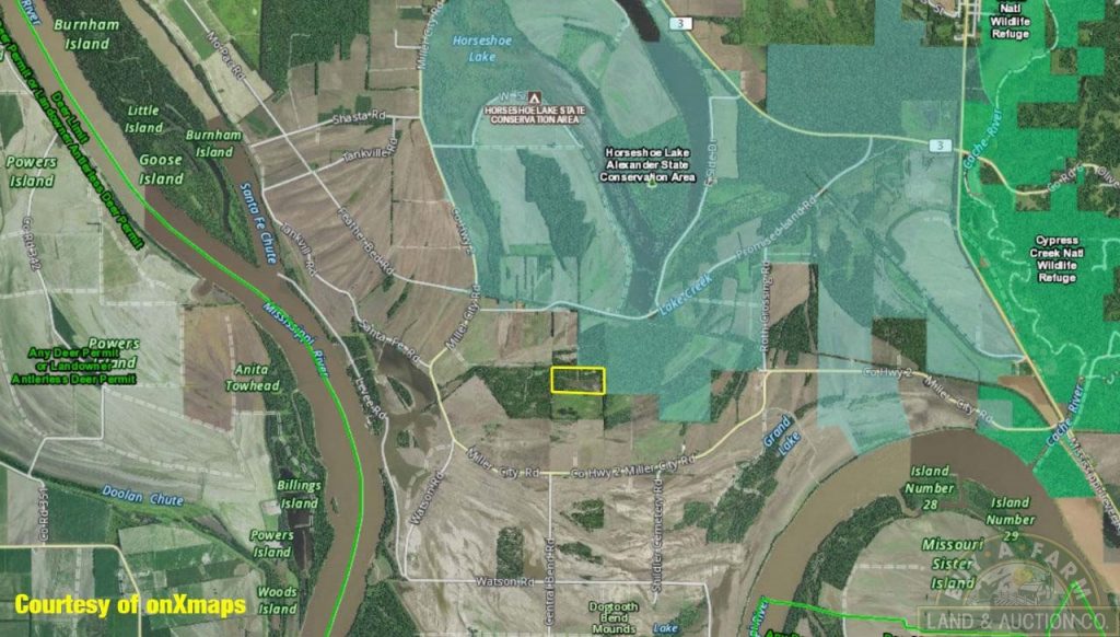 This secluded 80 acres is located at Olive Branch IL just South of Horseshoe Lake and off Promised Land Road. Traditionally a strong area for waterfowl and some excellent whitetail habitat also. The East 40 adjoins Horseshoe Lake-Alexander State Conservation Area on the north and east sides. The West 40 adjoins similar hunting properties on the north, west and south sides.