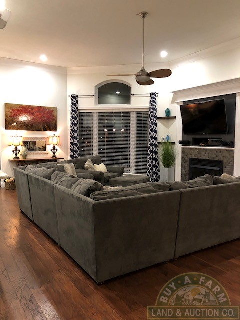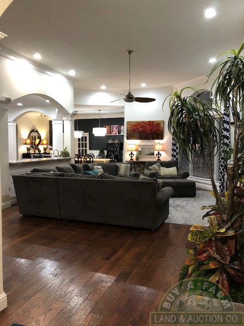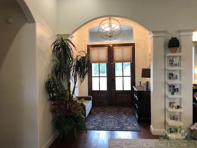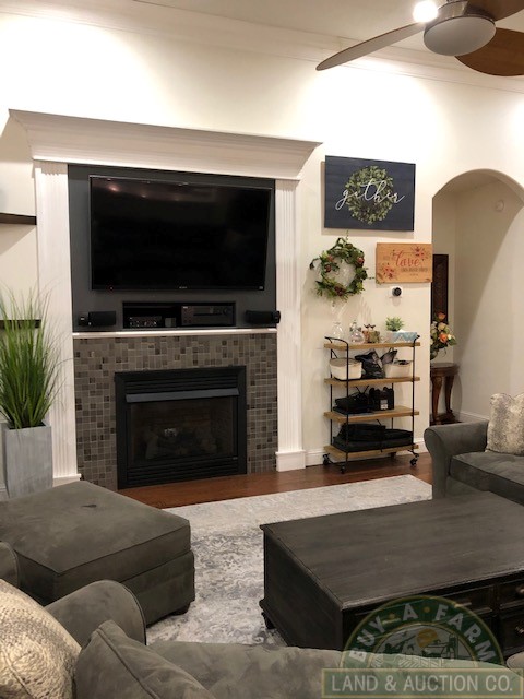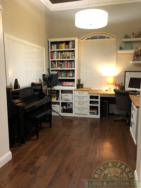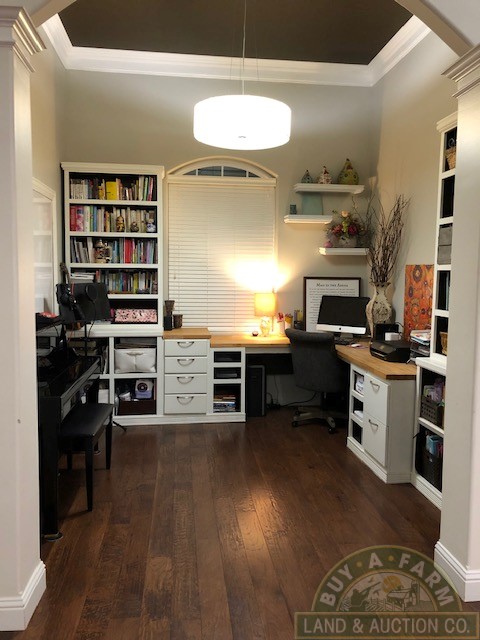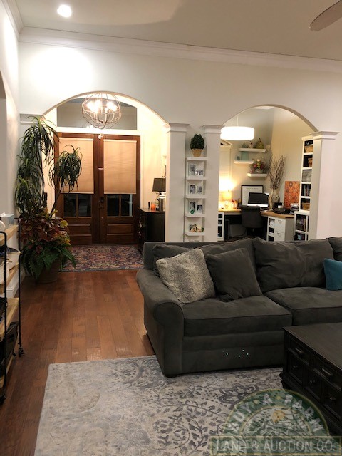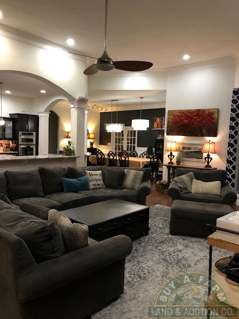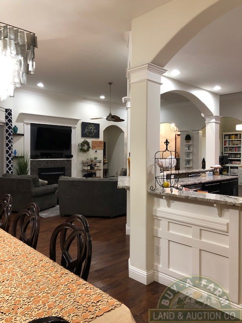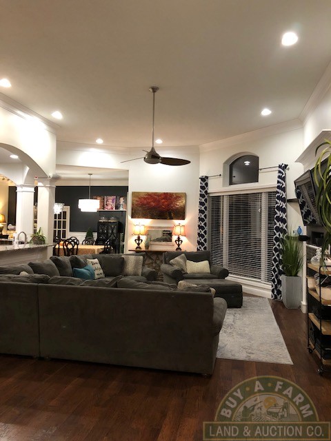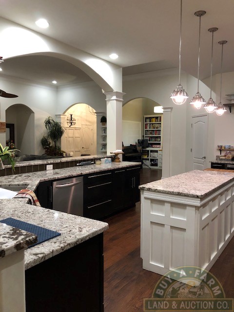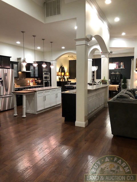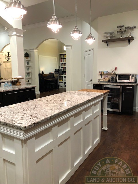 Entering through the main entry door you are immediately welcomed by the open floor plan and the spacious 12-foot ceilings in the foyer, den and living room. Elegantly designed with arched entry ways and hand-scraped hardwood flooring. This open living area flows into a spacious kitchen with quartz countertops, large prep island, walk-in pantry, wine fridge, high-end stainless appliances. The home is richly appointed with custom-built cabinets, built-in shelving, closets and ornate wood trim throughout.