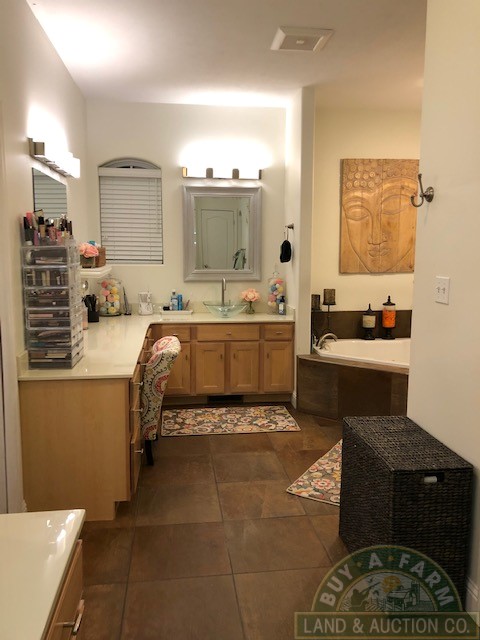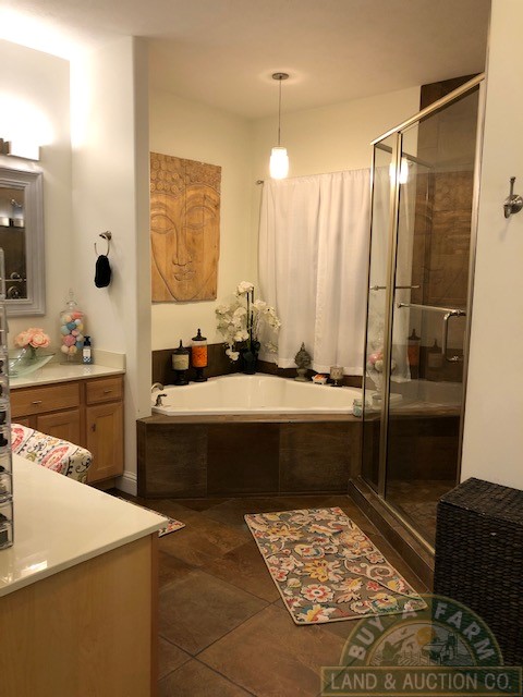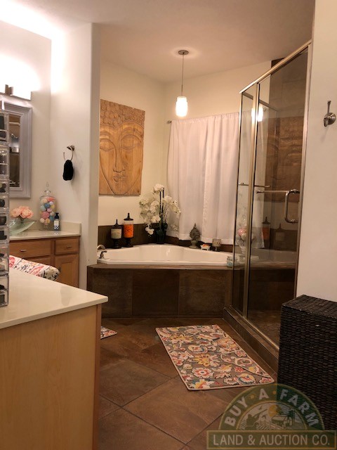 The master suite has his/her vanities and walk-in closets, linen closet, custom shower and whirlpool tub.