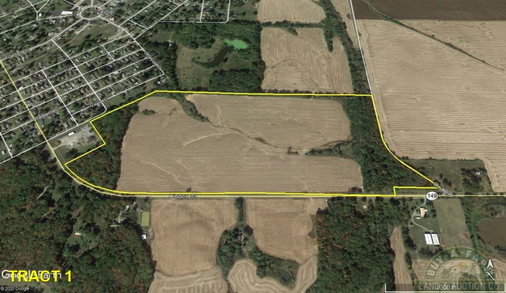 The Flowers family is offering 450+- acres at public auction on Thursday, March 25th.  The auction will be online only and closes at 8:00 PM CST. The farm lays at the East edge of Zeigler Illinois with frontage on IL Rt 149 and 2.8 miles North on Dry Road. It consists of 257 acres cropland and 213 wooded acres.  Hillside and creek bottom woodlands provide excellent whitetail, turkey and small game hunting and occasionally waterfowl. The property is offered as 4 separate tracts with no combinations.